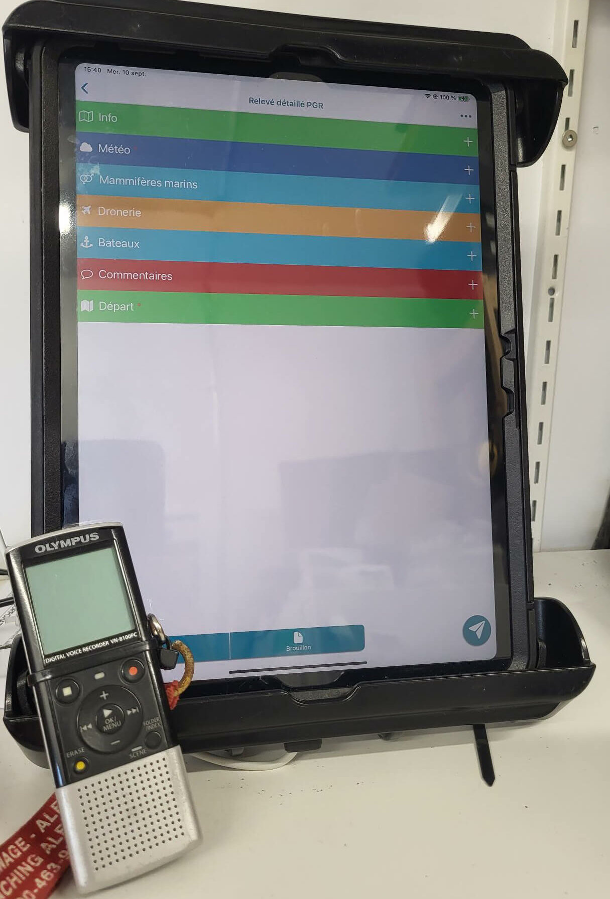 Sur le terrain, en parallèle des photographies, on prend en note des informations comme la couverture nuageuse, le vent, la hauteur des vagues, la visibilité, le nombre de bateaux, le nombre de baleines, ainsi que les informations relatives aux photographies et bien d’autres. Pendant mes premières années, on utilisait des dictaphones à cassette pour enregistrer ces données puis par la suite des dictaphones numériques. Au retour du terrain, il fallait écouter ces fichiers pour saisir toutes les informations dans un fichier Excel, ce qui représentait beaucoup de travail au bureau!