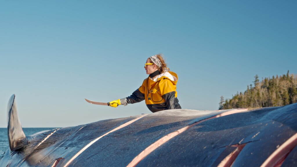 Une vétérinaire spécialisée en médecine zoologique effectue la nécropsie d’un rorqual commun en Gaspésie. © GREMM