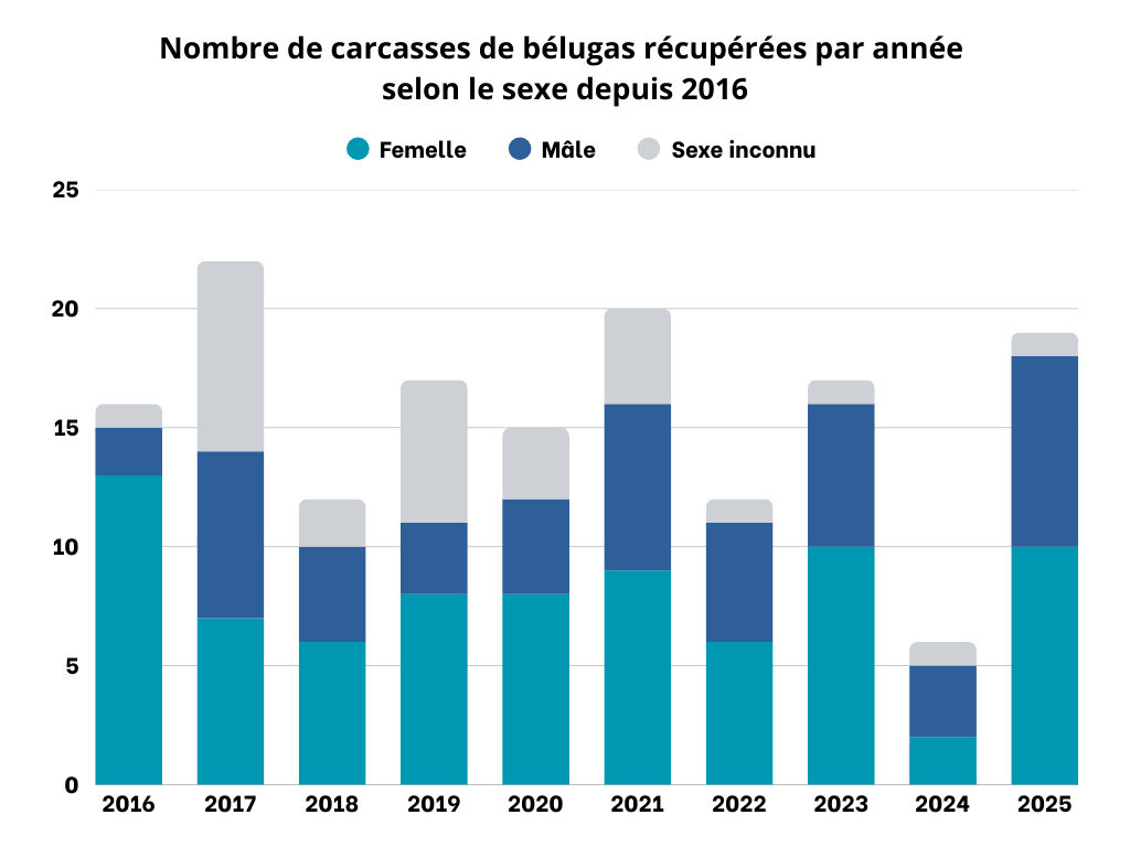 À l’heure de faire paraitre le bilan des mortalités de bélugas de 2025, trois carcasses ont déjà été signalées au Réseau québécois d’urgences pour les mammifères marins (RQUMM) depuis le début de l’année. En 2025, 19 carcasses ont été retrouvées à la dérive ou sur les rives du Saint-Laurent. Sur ce nombre, 10 sont des femelles, 8 sont des mâles et une n’était pas en assez bon état pour en déterminer le sexe.