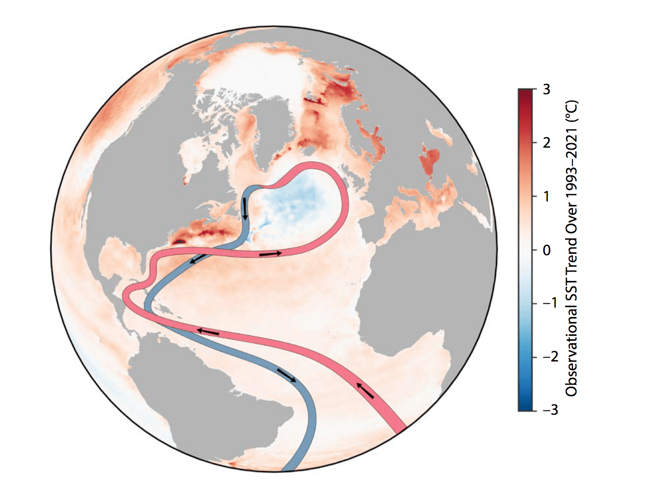 La raison première de ces températures soudainement plus élevées? L’apport en eau plus chaude du Gulf Stream dans le Saint-Laurent! Celui-ci est causé par des changements dans la circulation méridienne de retournement atlantique (AMOC) ; une énorme boucle de circulation d’eau dans l’océan Atlantique. L’eau froide et salée, étant plus dense, se propulse à de grandes vitesses vers les fonds marins au nord du globe. Quand elle atteint des eaux plus chaudes, elle remonte à la surface et la boucle recommence. C’est un équilibre nécessaire à presque tous les écosystèmes côtiers, mais cet équilibre est fragile. Avec le réchauffement des eaux mondiales et l’apport supplémentaire en eau douce causé par la fonte des glaciers, les mécaniques qui font fonctionner cette boucle ralentissent et risquent même de s’arrêter. En ralentissant, l’AMOC pousse le Gulf Stream davantage vers la côte est des Amériques. Ce dernier rentre plus directement dans le golfe du Saint-Laurent, remplaçant l’eau plus froide et oxygénée qui provenait historiquement du courant du Labrador venant du Nord.