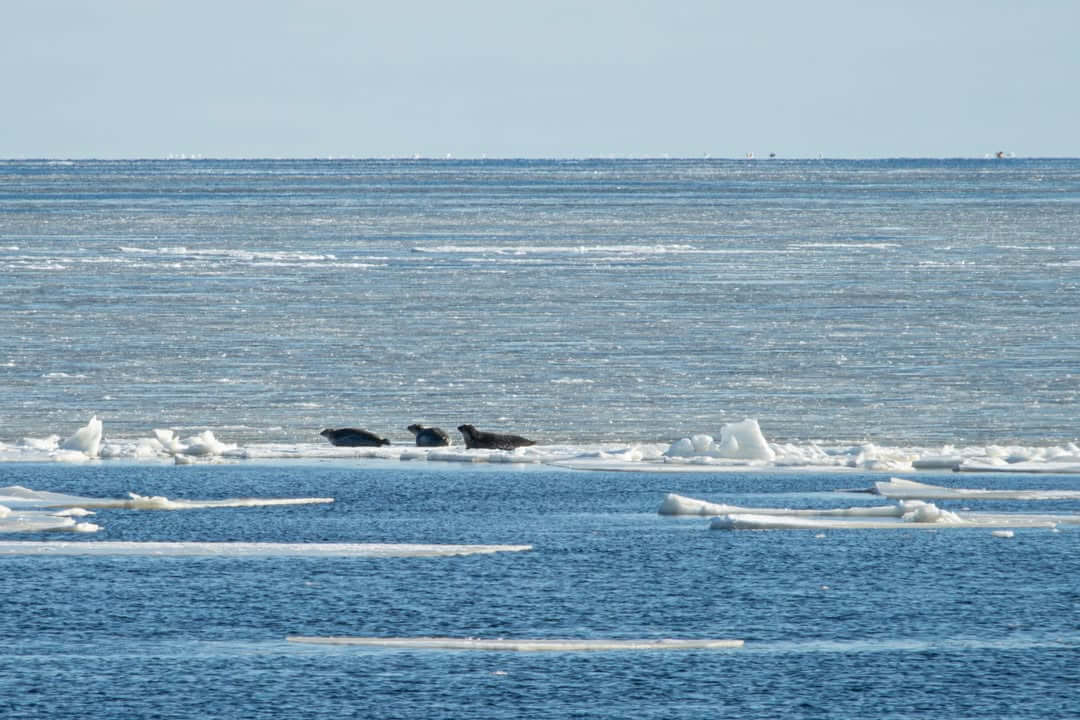 « Le 26 janvier, en bord de mer, vis-à-vis la maison de mon voisin d’en face, un beau phoque que je pense être un phoque du Groenland qui se prélassait sur un morceau de glace. », raconte une observatrice basée à Gallix. « C’était bien beau à voir avec toute cette belle neige qui tombait! » ajoute-t-elle. Lorsque les phoques en dehors de l’eau s’étirent et courbent le dos, on dit en bon français qu’ils font la « banane »! Près de Baie-Comeau, des phoques du Groenland sont également signalés. Quelques jours plus tard, ce sont des phoques communs qui se prélassaient à Port-Cartier. Ils étaient au moins cinq, voire plus, mais difficile à confirmer en raison de la distance.