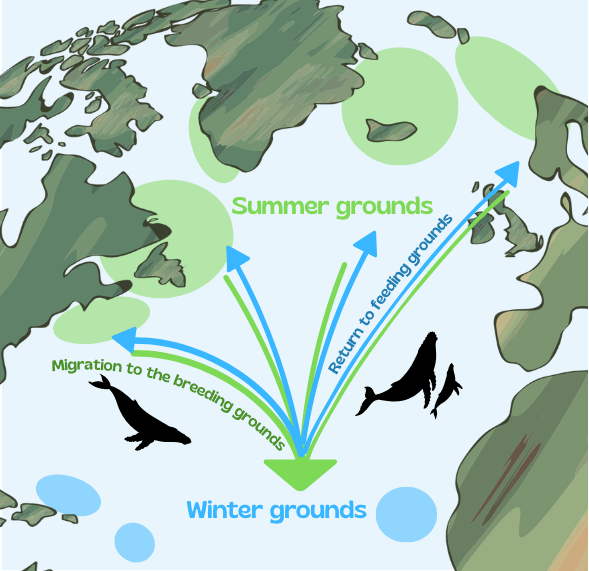 This waste has a funnel effect. In other words, these migratory whales feed over expansive swathes of icy waters and gather in smaller areas near the Equator for reproduction and calving. This phenomenon concentrates nutrients in specific locations, resulting in rich ecosystems in an otherwise nutrient-poor environment.
