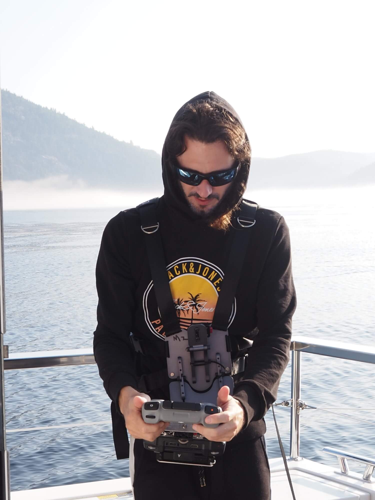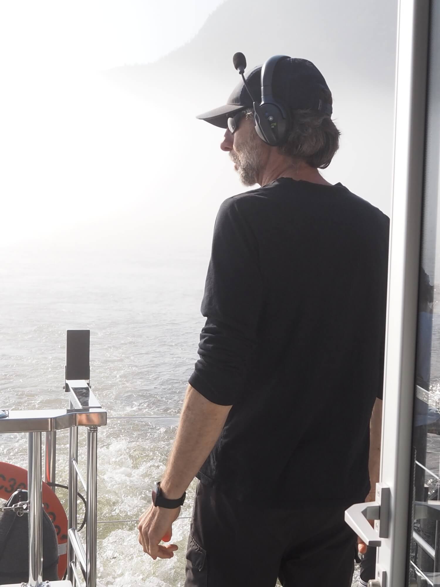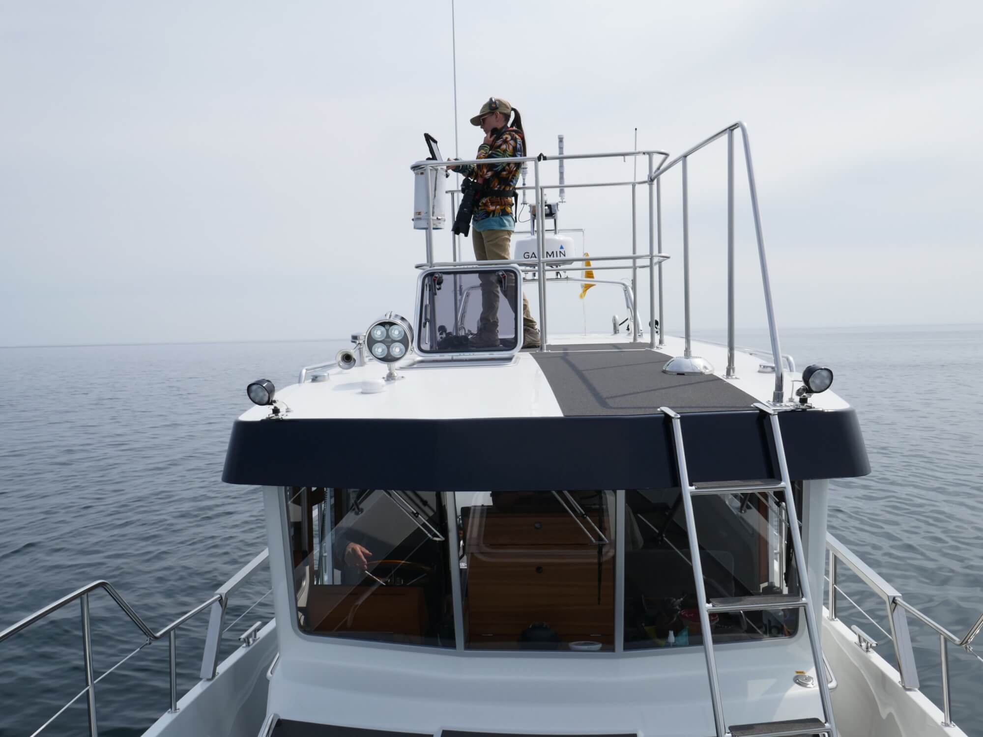 L’équipe de recherche du Groupe de recherche et d’éducation sur les mammifères marins (GREMM) embarque à 7 heures tapantes sur le quai de Tadoussac. Elle est composée de quatre personnes : Michel, le capitaine, Mathieu le pilote de drone et l’assistante de recherche Estelle, ainsi que de Jade-Audrey à la prise de données et la photo-identification. Les mauvaises conditions dans l’estuaire poussent l’équipe à s’embarquer dans le fjord du Saguenay, où la brume s’est déjà partiellement engouffrée.