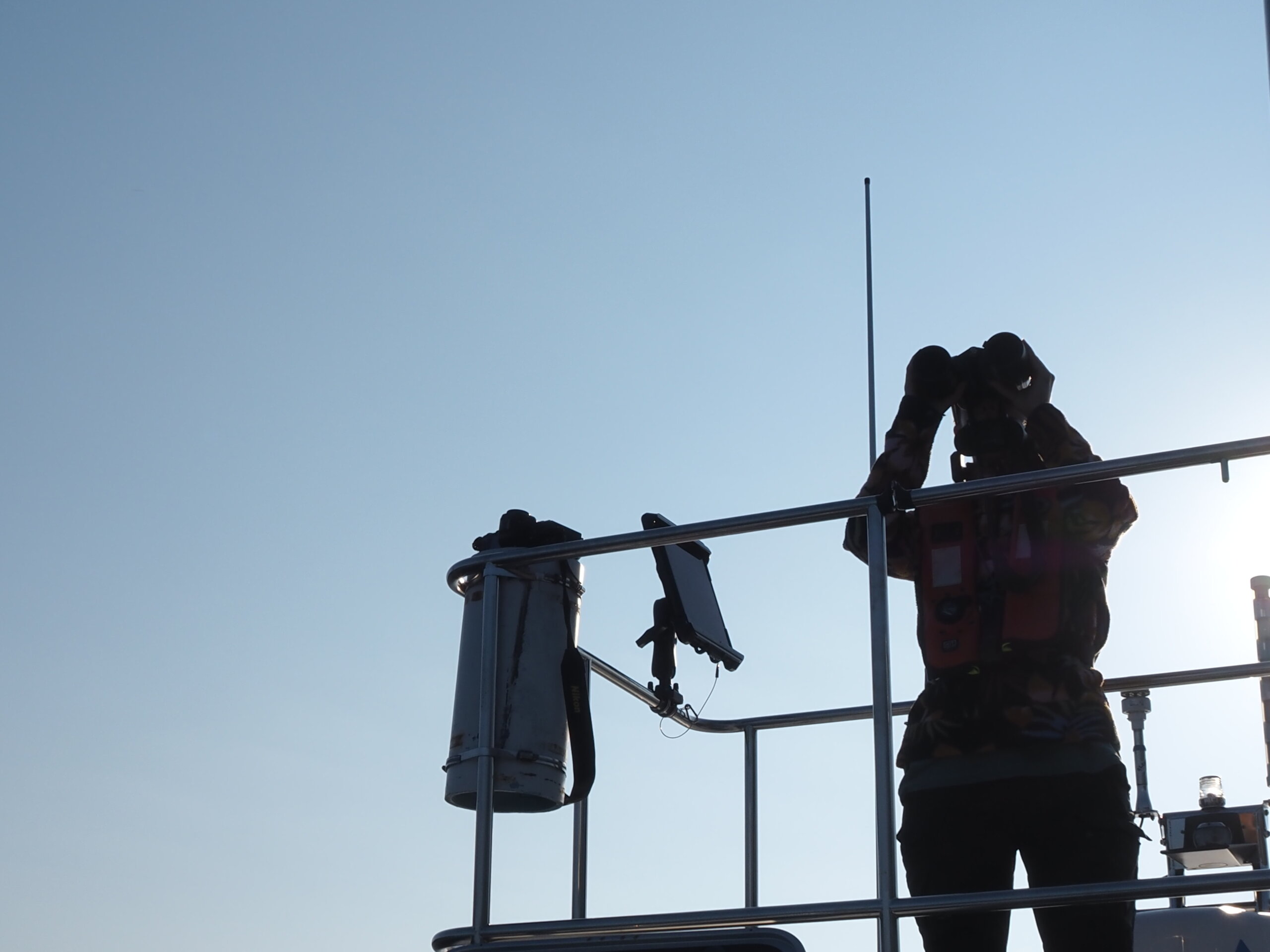 L’éblouissement – ou « glare » – a rendu certaines zones inaccessibles au travail, car le reflet du soleil sur l’eau ne permet pas de bien voir les bélugas. L’assistante doit rester debout, sans bouger, avec tout l’équipement nécessaire : son VFS, son manteau, ses jumelles, son appareil photo (fort pesant), son casque d’écoute et le micro, et bien sûr la tablette pour prendre les données. Tout ça sachant qu’un seul contact peut durer parfois deux heures!