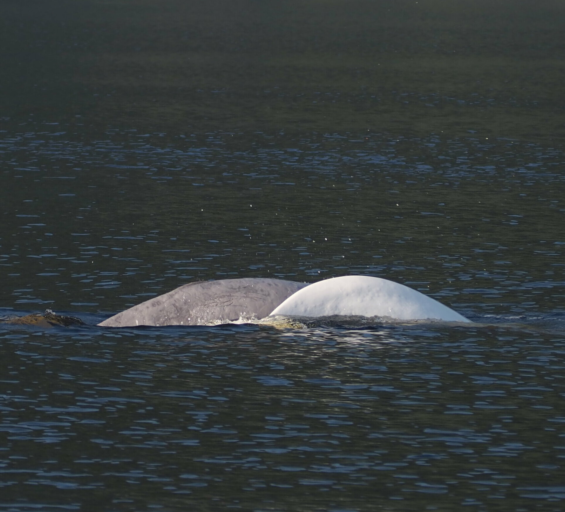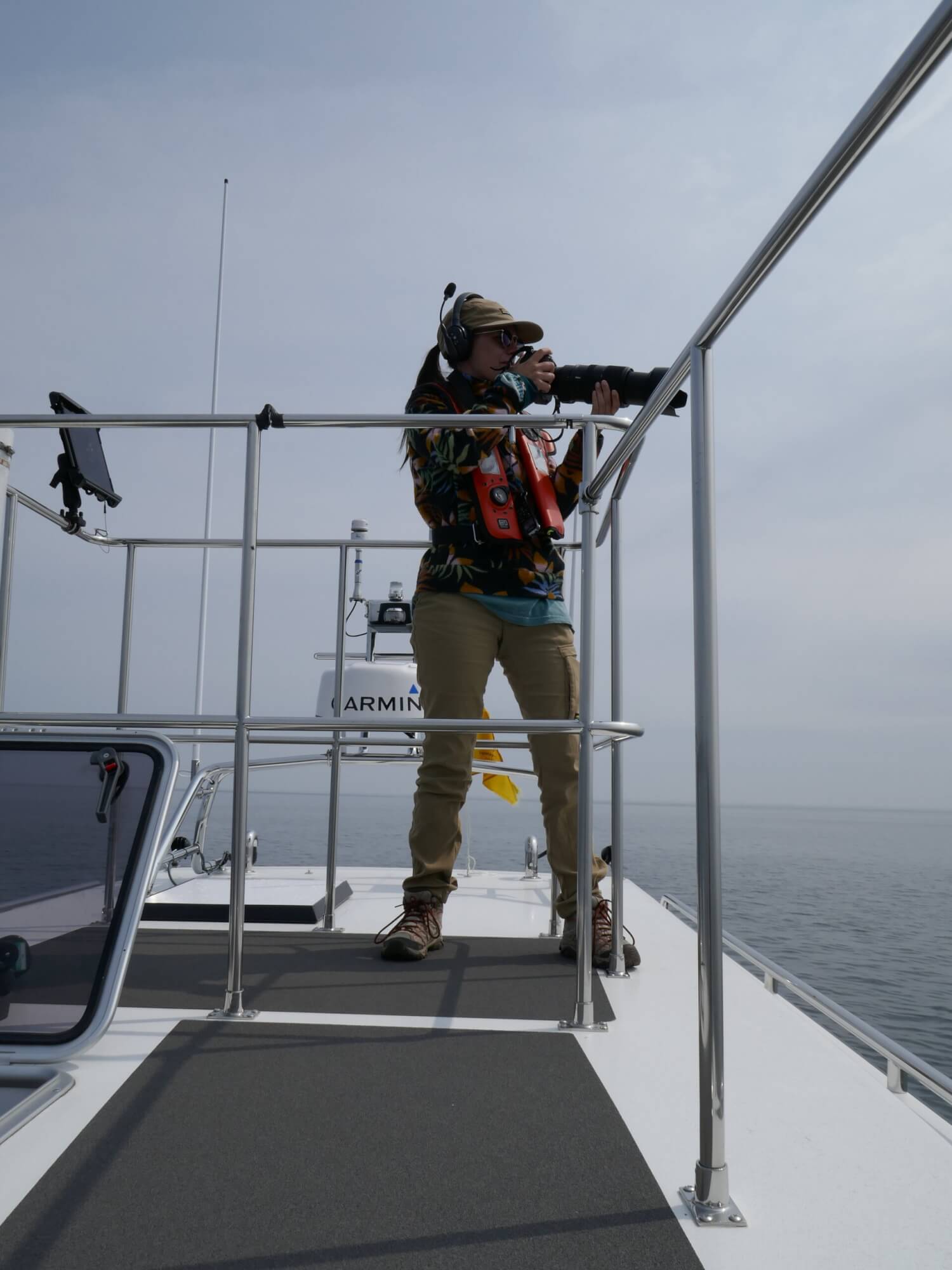 Avec son Nikon Z8 et sa lentille 100-400 mm, l’assistante de recherche pointe son objectif sur tous les bélugas qu’elle parvient à voir dans un rayon de 100 mètres. Son enjeu principal : essayer de photographier tous les bélugas présents aux alentours du bateau. Néanmoins, les bélugas sont souvent difficiles à reconnaitre lorsqu’ils ne présentent pas de marques particulières.